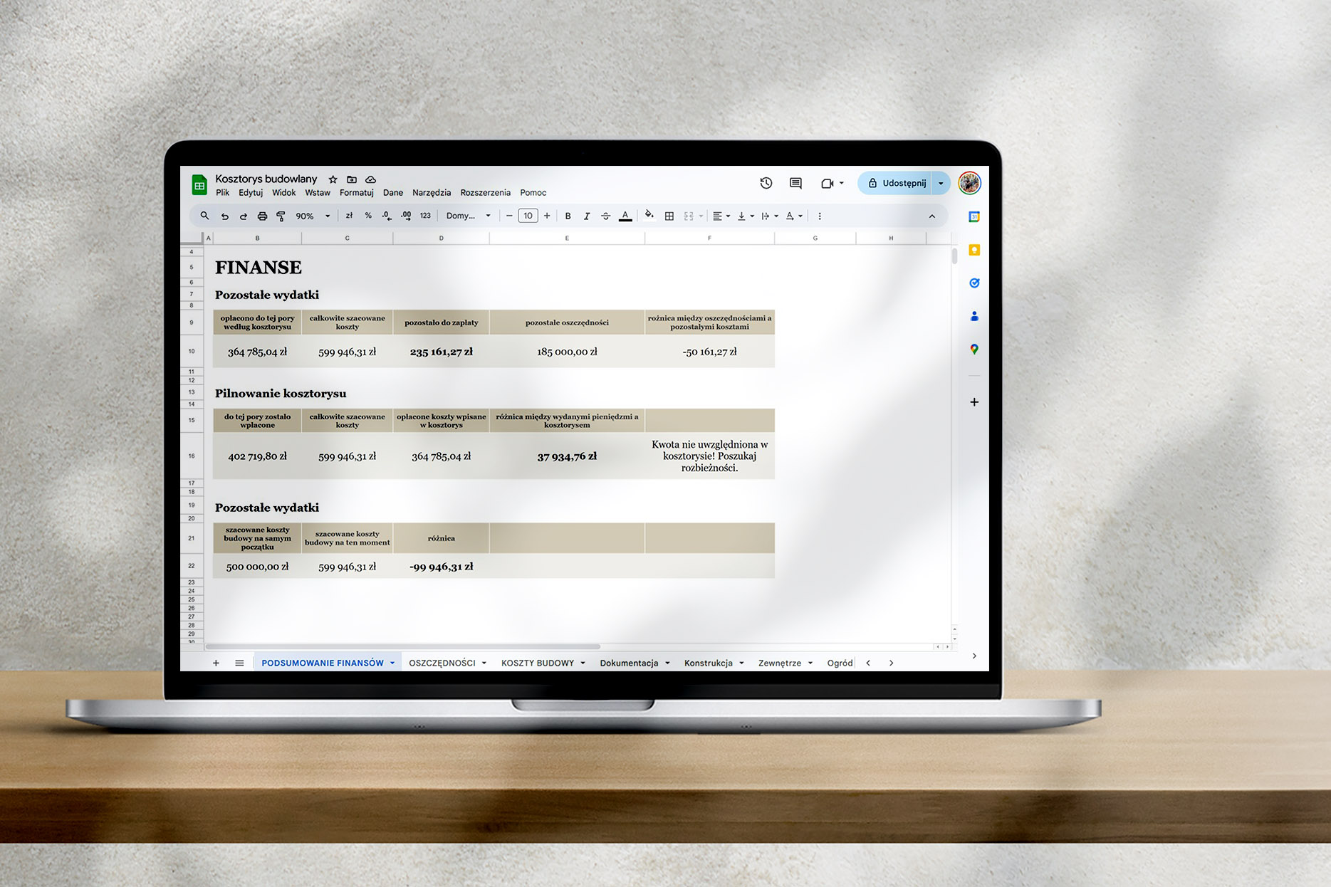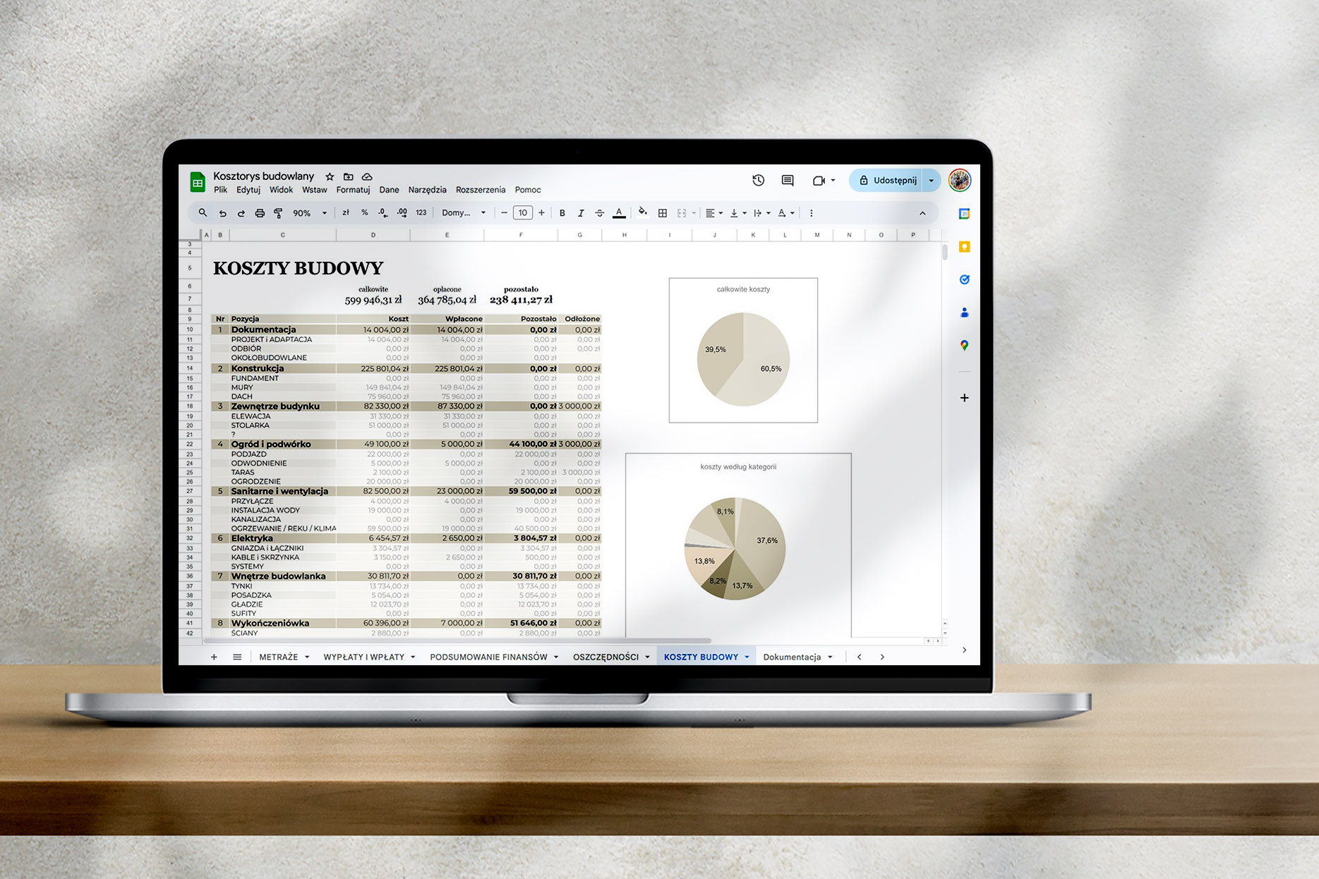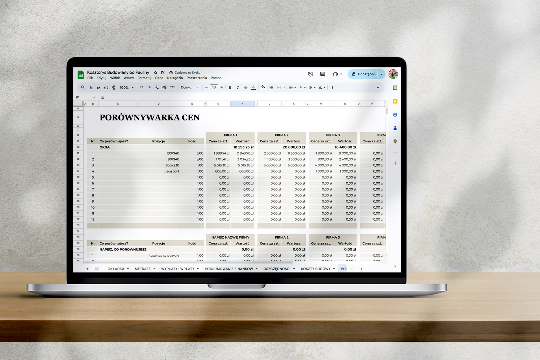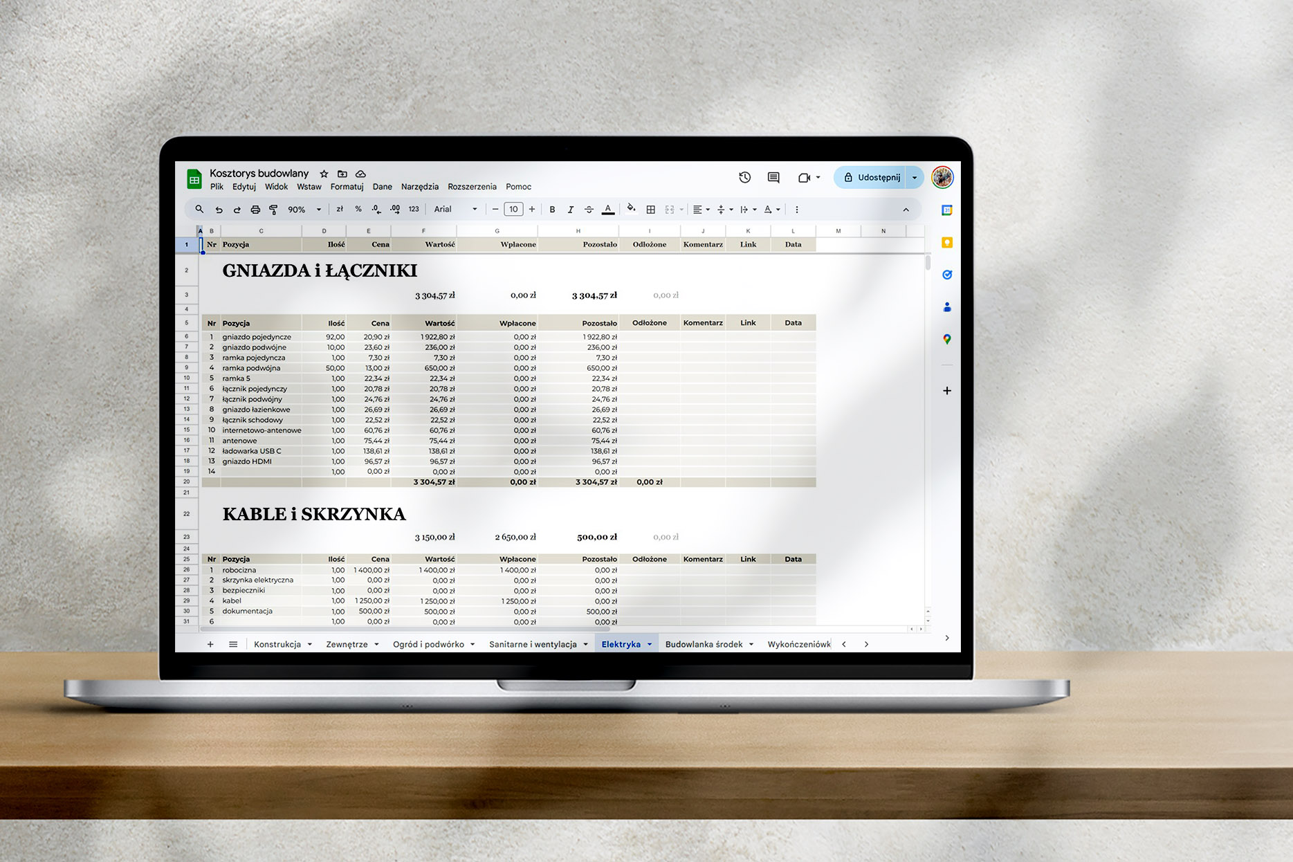 Kosztorys jest przygotowany do otwarcia w darmowym edytorze Arkusze Google lub w Excelu Microsoftu. Można go otworzyć dowolnym innym programem do arkuszy kalkulacyjnych, ale może rozjechać się trochę graficznie.